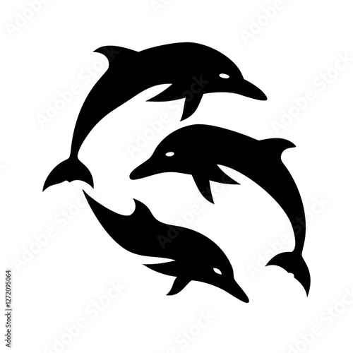 Fototapeta premium Vector art of three dolphins jumping in a circle, isolated on white background, a playful scene of marine life in a minimalist design