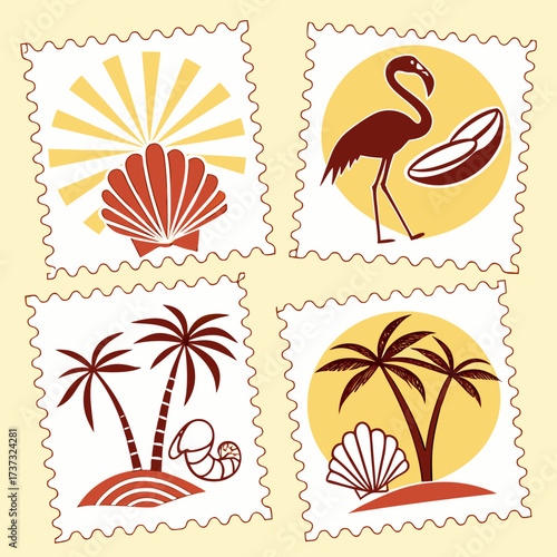 © sabrina1122, Naklejka premium Vector art of tropical paradise stamp collection featuring sun, palm tree, flamingo, leaves, and sea shell in a vintage style, perfect for summer and vacation themes