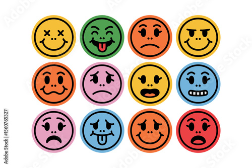 © Design Point, Naklejka premium Vector art of twelve retro emoji faces isolated on white background