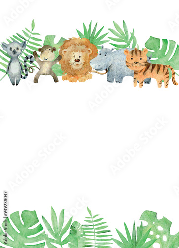 Fototapeta premium Vector Baby shower card. Watercolor safari card with animals.
