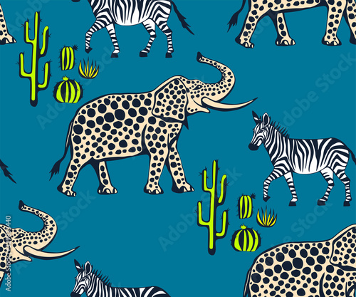 © Artmirei, Naklejka premium Vector background hand drawn exotic wild animals. Hand drawn ink illustration. Modern ornamental decorative background. Vector pattern. Print for textile, cloth, wallpaper, scrapbooking