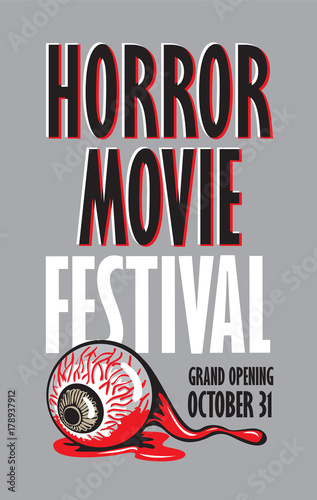 Fototapeta premium Vector banner for festival horror movie. Torn human eye in a pool of blood. Scary movie promotional print. Can be used for advertising, banner, flyer, web design
