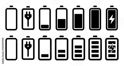 Fototapeta premium Vector battery icons showing various charge levels and charging states. Perfect for mobile apps, UI design, tech dashboards, and energy related infographics.