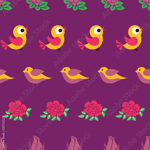 © designer_27, Obraz premium Vector birds and roses horizontal lines seamless