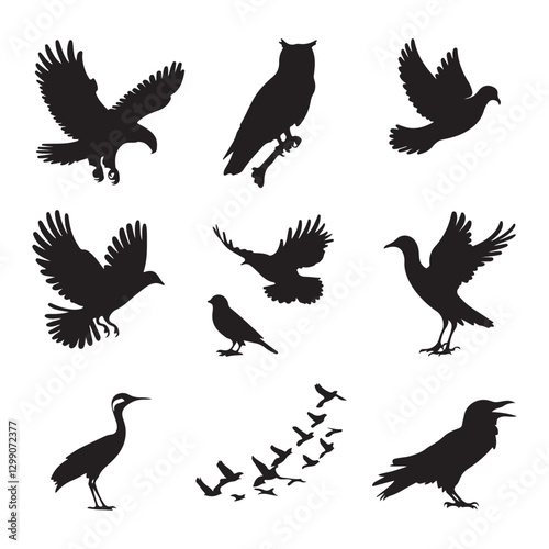 © logodesign11, Obraz premium Vector birds silhouettes Sparrows Silhouette Pigeons Flying Silhouettes 1 brid silhouette
