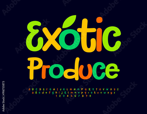 Fototapeta premium Vector bright signboard Exotic Produce. Playful Colorful Font. Bright Alphabet Letters and Numbers set.