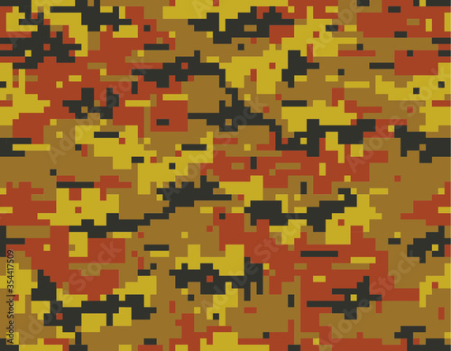 © Dusan, Fototapeta premium Vector camouflage seamless pattern. Autumn color scheme. Copper brown, brick red, ocher yellow and black. Digital (pixelated) shapes.