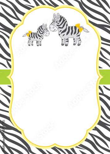 © TheCreativeMill, Obraz premium Vector Card Template with Cute Cartoon Zebras on Stripes Background.
