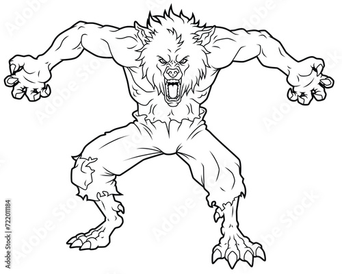 Obraz premium Vector Cartoon Angry Werewolf With Sharp Fangs And Claws Line Art