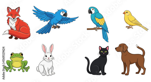 Naklejka premium Vector cartoon animals illustration fox parrot canary frog rabbit cat dog vector drawing educational resource art