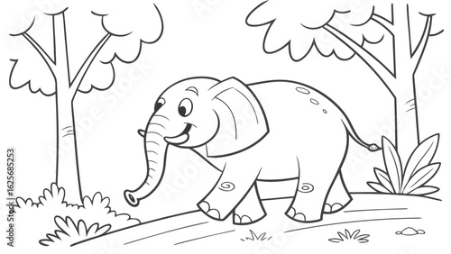 © lampungrevengestudio, Naklejka premium Vector Cartoon funny Elephant, funny image in the forest, Coloring book page for children. Line Art isolated on white background