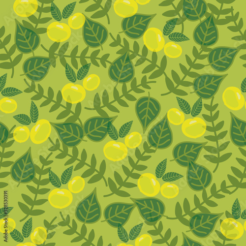 © Shobhana, Fototapeta premium Vector celebrating nature with lemons leaves yellow green seamless pattern background. Suitable for fabric/ home decor, giftwrapping, wallpaper and scrapbooking projects.