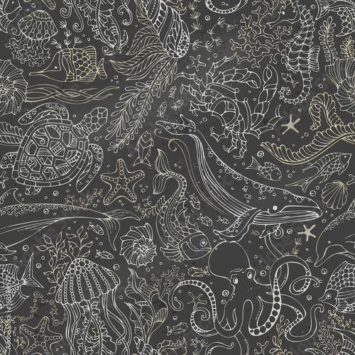 Fototapeta premium Vector chalk underwater sea life boundless blackboard background.