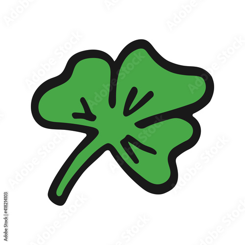 © Olha, Obraz premium Vector clover icon in hand drawn style. Colorful leaf symbol with black outline. Isolated illustration on white background. Cartoon pictogram for game. Doodle clover leaf picture.