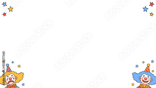 Fototapeta premium Vector clown border is showcasing cartoon stars and two clowns on transparent canvas, copy space