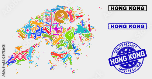 Fototapeta premium Vector collage of technology Hong Kong map and blue watermark for quality product. Hong Kong map collage constructed with tools, wrenches, production symbols.