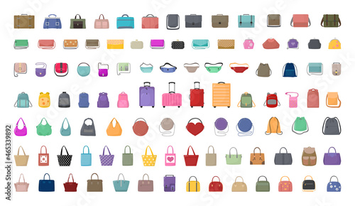 Fototapeta premium Vector collection of colorful bags, suitcases and backpacks.