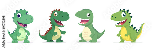 © gomolach, Naklejka premium Vector Cute Kind Baby Kid Smiling Dinosaur Set. Happy Cartoon Green Dinosaur Tyrannosaurus Rex, Tyrex Collection in Flat Style Isolated