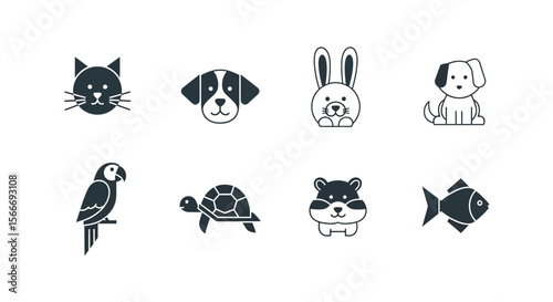 Fototapeta premium Vector cute pet animal icons vector set featuring cat dog rabbit parrot turtle hamster and fish simple line art