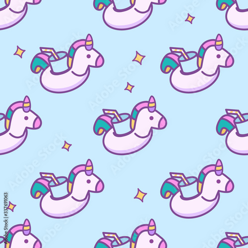 Fototapeta premium Vector cute seamless linear unicorn drink holder for pool pattern with stars in doodle cartoon style on blue pastel background