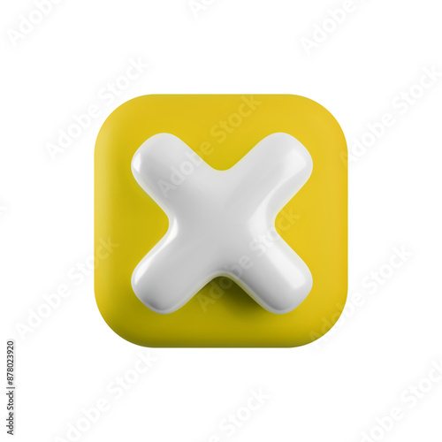 © Ketmut, Obraz premium Vector 3d cross x realistic icon. Trendy square plastic wrong yellow check mark, delete sign on white background. No vote button. 3d render not approved symbol, error, failed sign for web design, app.