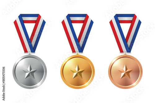 © gomolach, Naklejka premium Vector 3d Gold, Silver, Bronze Medal Set. Award Medals for Sport. Medal Icon, Isolated. Medal Badge Collection. Winner First Second Third Place Trophy Design Template for Championship