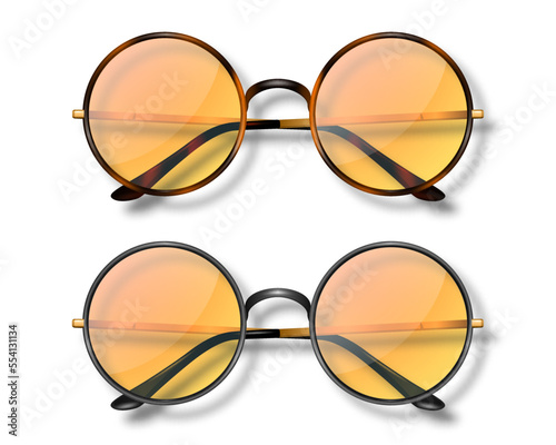© gomolach, Fototapeta premium Vector 3d Realistic Round Frame Glasses Set Glass Isolated, Transparent Sunglasses for Women and Men, Accessory. Optics, Lens, Vintage, Trendy Glasses. Top View