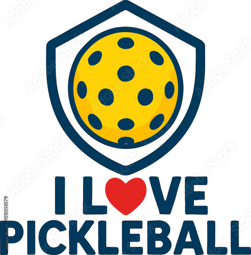 © Alghas, Obraz premium Vector design featuring a yellow pickleball inside a blue shield, with the phrase "I love Pickleball" in bold typography