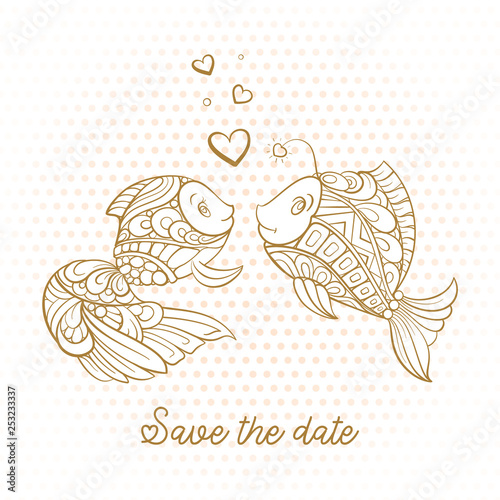 © sablegear, Obraz premium Vector doodle cute fishes couple. Cartoon style wedding invitation