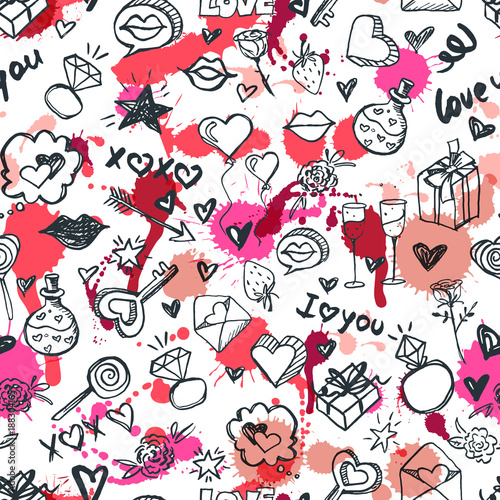 © Alina Kryshtal, Naklejka premium Vector doodle romantic seamless pattern. Design for fashion textile print, wrapping, valentines day backgrounds.