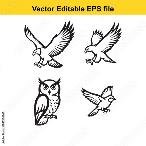 © ShahAlam, Obraz premium vector editable eps file of four different bird silhouettes flying and standing