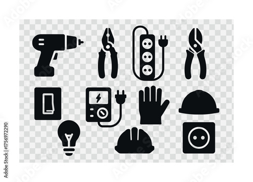 Fototapeta premium Vector Electrician tools silhouettes: drill, pliers, socket, voltage tester,...