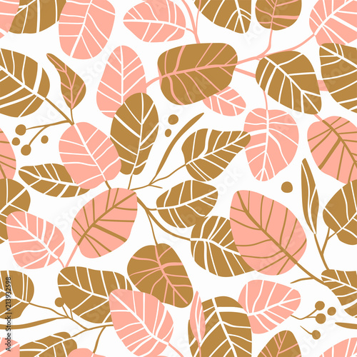 © Utro na more, Obraz premium Vector elegant seamless background with foliage. wedding endless pattern in pink and gold colors with leaves.