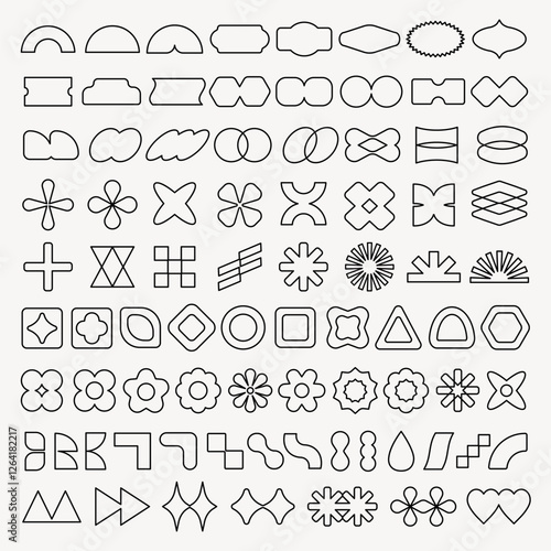 Fototapeta premium Vector elements. Collection of geometric shapes, outlines of geometric forms, abstract geometric patterns, and diverse geometric designs in a grid layout. Black shapes, vector element set.
