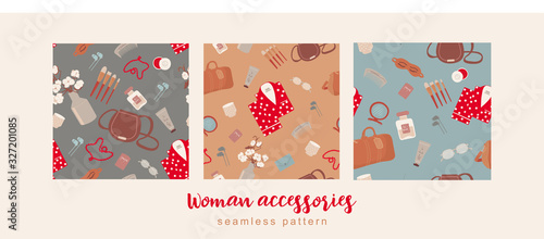 © elimika, Fototapeta premium Vector fashion hand drawn seamless pattern with women’s accessories and cosmetics. Women’s background with bags, makeup tools, glasses, pajamas and vase with cotton for design end packages product