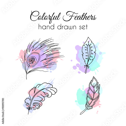 Obraz premium Vector feathers set. Hand drawn ethnic elements. Sketchy feather.