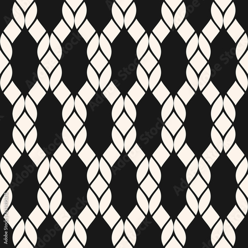 © Olgastocker, Naklejka premium Vector fishnet seamless pattern. Black and white geometric nautical texture with net, mesh, weave, knitting, grid, lattice, fabric, ropes. Simple abstract monochrome background. Repeatable design