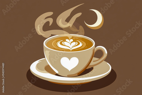 © SHUMAYA, Obraz premium Vector flat logo of a cappuccino with heart-shaped foam on a brown background,