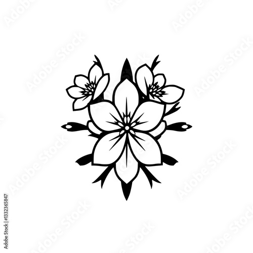 Fototapeta premium Vector floral illustration featuring three stylized flowers in a symmetrical composition, rendered in bold black against a crisp white background.