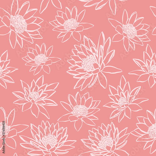 © Nespola Designs, Obraz premium Vector floral seamless pattern of lotus, sketchy hand drawn illustration of pink waterlily. Feminine design for fabric, decor and scrapbooking.