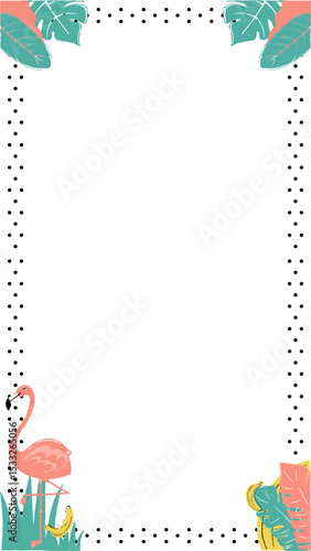 Obraz premium Vector frame is showing tropical leaves, pink flamingo and yellow bananas on...