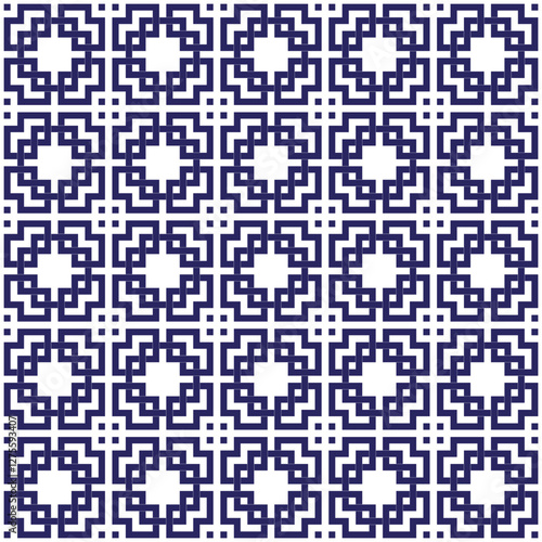 © Yani Aulia, Fototapeta premium Vector geometric seamless pattern featuring interlocking squares and circular motifs in a classic blue and white palette. Chinese window tracery.