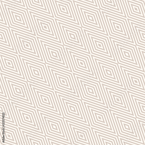 © Olgastocker, Fototapeta premium Vector geometric seamless pattern with rhombuses, stripes, diagonal lines, zigzag, chevron. Subtle modern abstract striped texture. Delicate white and beige background. Decorative design element