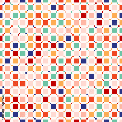 © Olgastocker, Fototapeta premium Vector geometric seamless pattern with small colorful squares. Pixel art. Cute funky childish texture. Simple abstract multicolor background. Modern repeat design for decor, wrapping, print, wallpaper