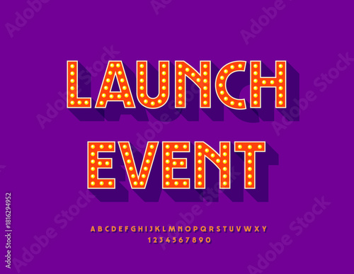 Obraz premium Vector glowing poster Launch Event. Elegant Light Bulb Font. Electric Lamp...