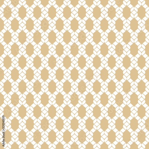© Olgastocker, Fototapeta premium Vector golden mesh pattern. Abstract gold and white geometric seamless background. Simple texture with fishnet, ropes, knitting, thread, grid, lattice, fabric, net. Repeat design for decor, wallpapers