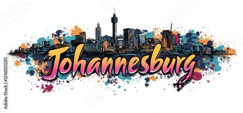 © Maxim Borbut, Fototapeta premium Vector graffiti calligraphy text "Johannesburg" with a skyline in the background, ink splashes, on a white background