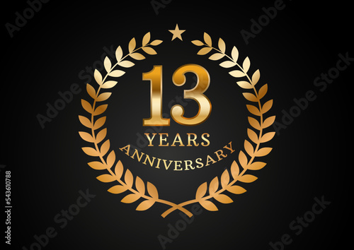 © Cipta, Naklejka premium Vector graphic of Anniversary celebration background. 13 years golden anniversary logo with laurel wreath on black background. Good design for wedding party event, birthday, invitation, brochure, etc