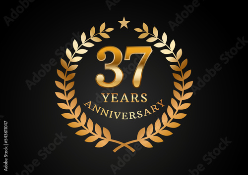 © Cipta, Naklejka premium Vector graphic of Anniversary celebration background. 37 years golden anniversary logo with laurel wreath on black background. Good design for wedding party event, birthday, invitation, brochure, etc