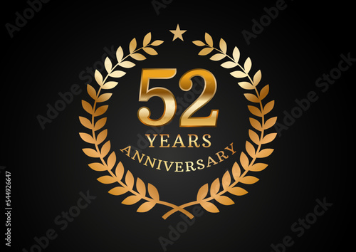 © Cipta, Fototapeta premium Vector graphic of Anniversary celebration background. 52 years golden anniversary logo with laurel wreath on black background. Good design for wedding party event, birthday, invitation, brochure, etc